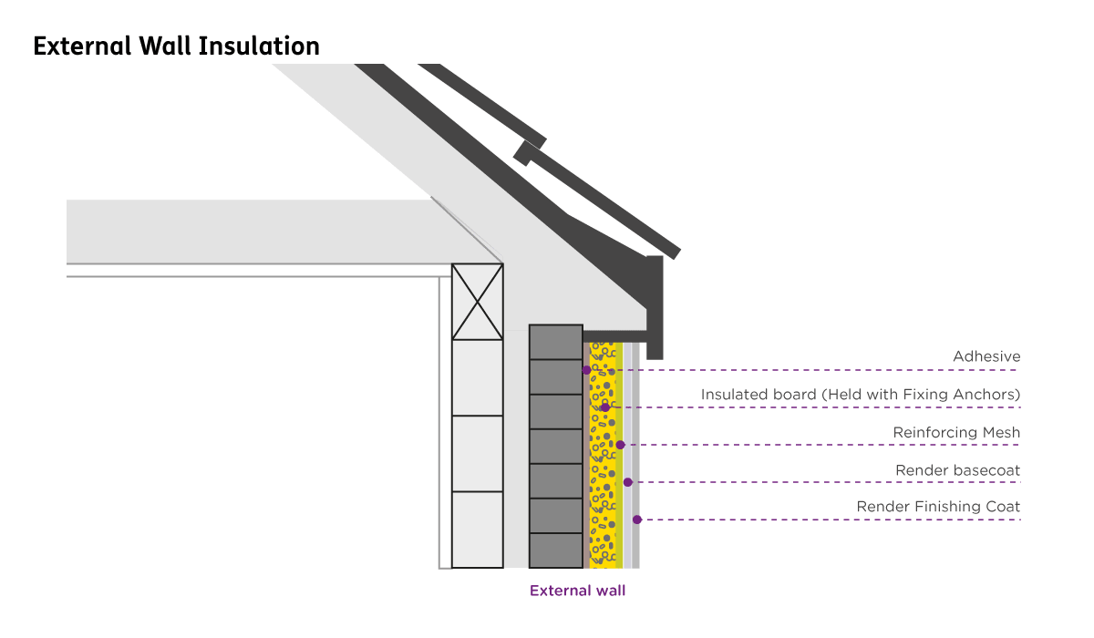 External wall insulation involves fixing a layer of insulation material to the outside walls of your home. This insulation is then covered with a special type of render or cladding. The installation process is non-disruptive and will never reduce the floor area of your home. In fact, the process renews the appearance of outer walls to improve the overall quality of your home.